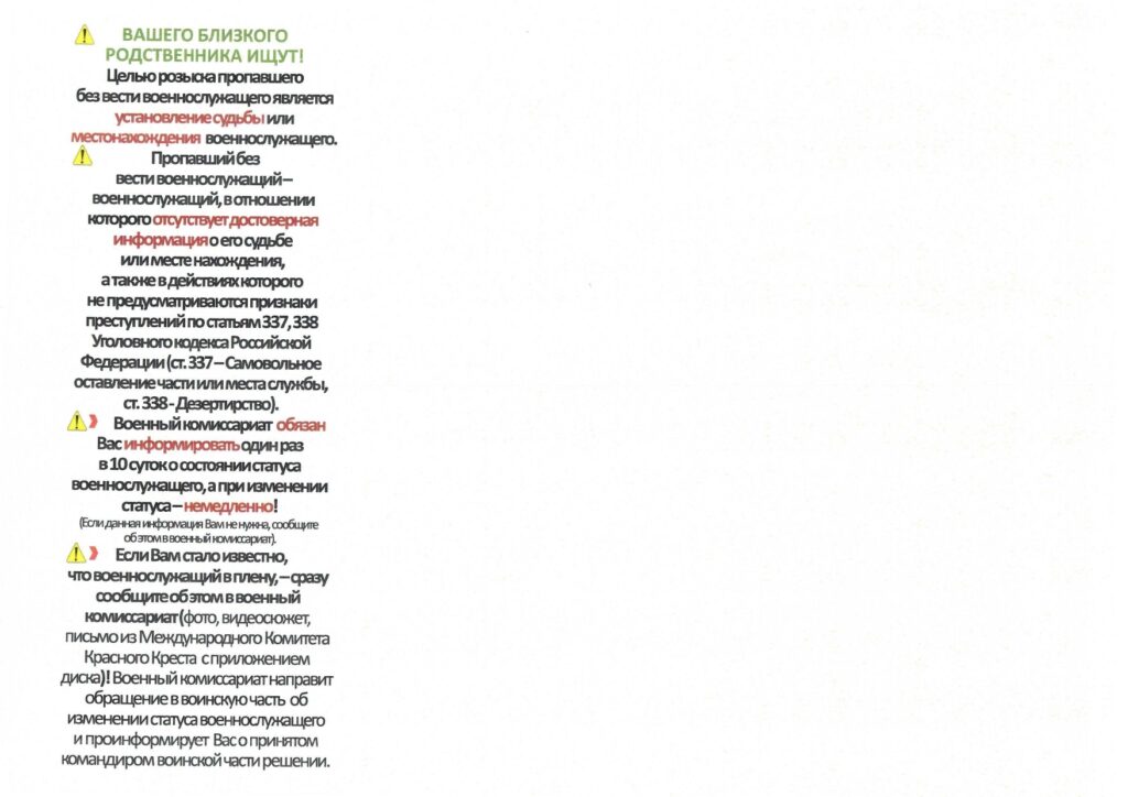 Министерством обороны Российской Федерации, в целях соблюдения прав и реализации социальных гарантий граждан Российской Федерации, снижения роста социальной напряжённости, вызванной отсутствием информации о судьбе пропавших без вести военнослужащих, продолжается выполнение комплекса мероприятий по организации розыска и установлению личности военнослужащих в случае их гибели или пропажи без вести в период проведения специальной военной операции.